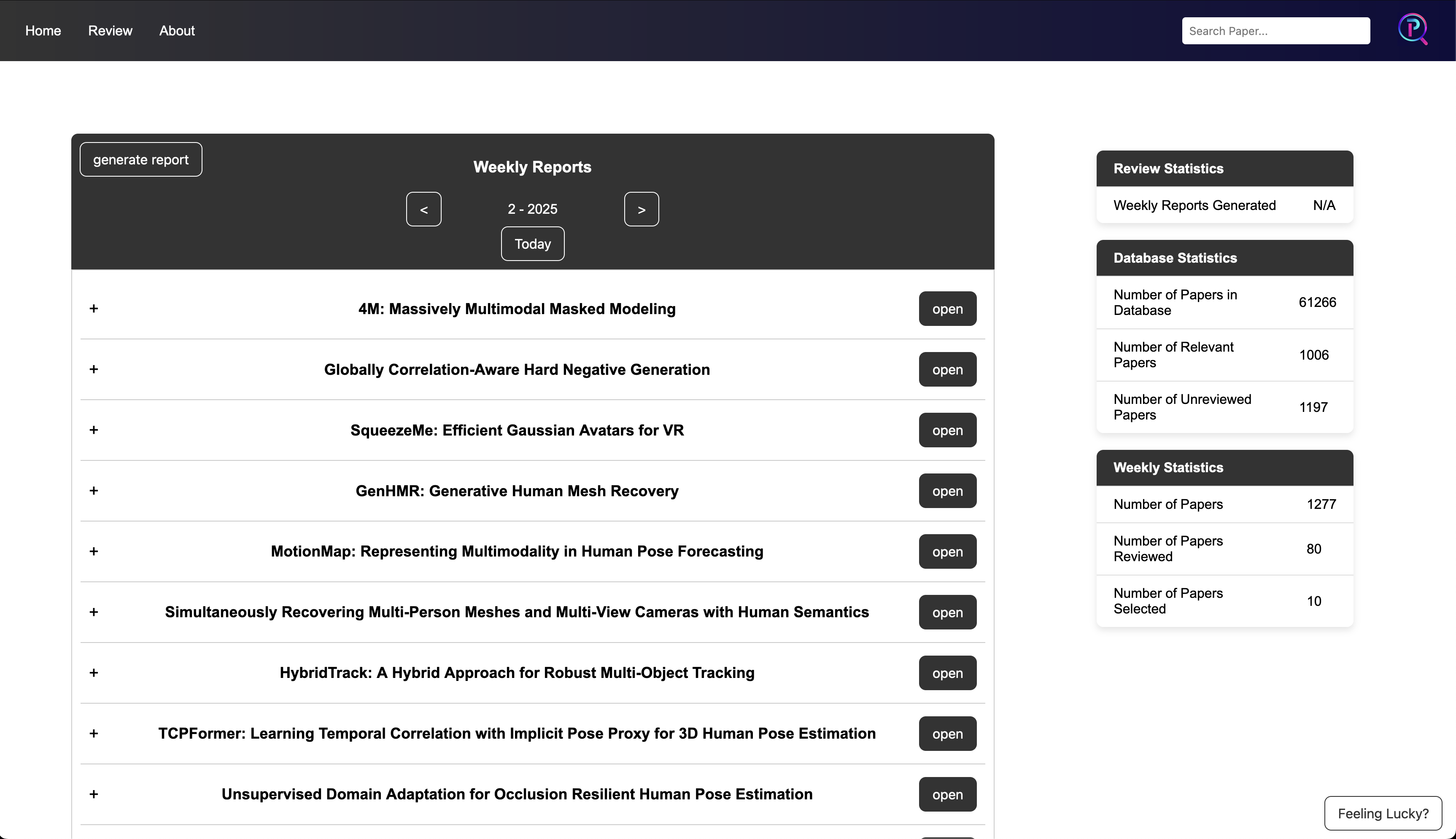 The interface features a simple UI with two main sections: the overview and the review page. The overview displays all reviewed and selected papers, organized by I chose to use weekly cycles for aggregating the papers, as this provides a good balance between recency and manageable volume. , along with relevant metadata.