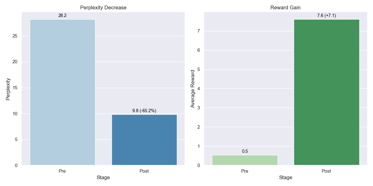 Through the initial generator finetuning with the whole (true) dataset, the models perplexity is reduced from 28 down to 10 which shows good alignment with the ground truth. Examples of the generated titles are shown further below. Another evaluation of the system is looking at the averaga reward before and after the RLHF training. The finetuned generator is able to produce output that increases the average reward from 0.5 to 7.5 using the initially trained reward model.