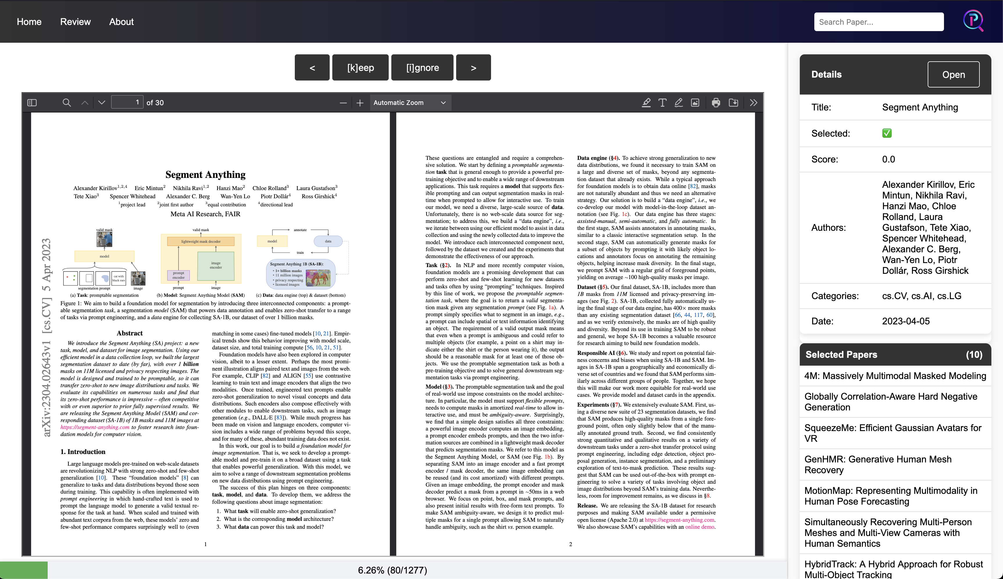 The review page features centrally located navigation and paper selectors (ignore or keep), which can